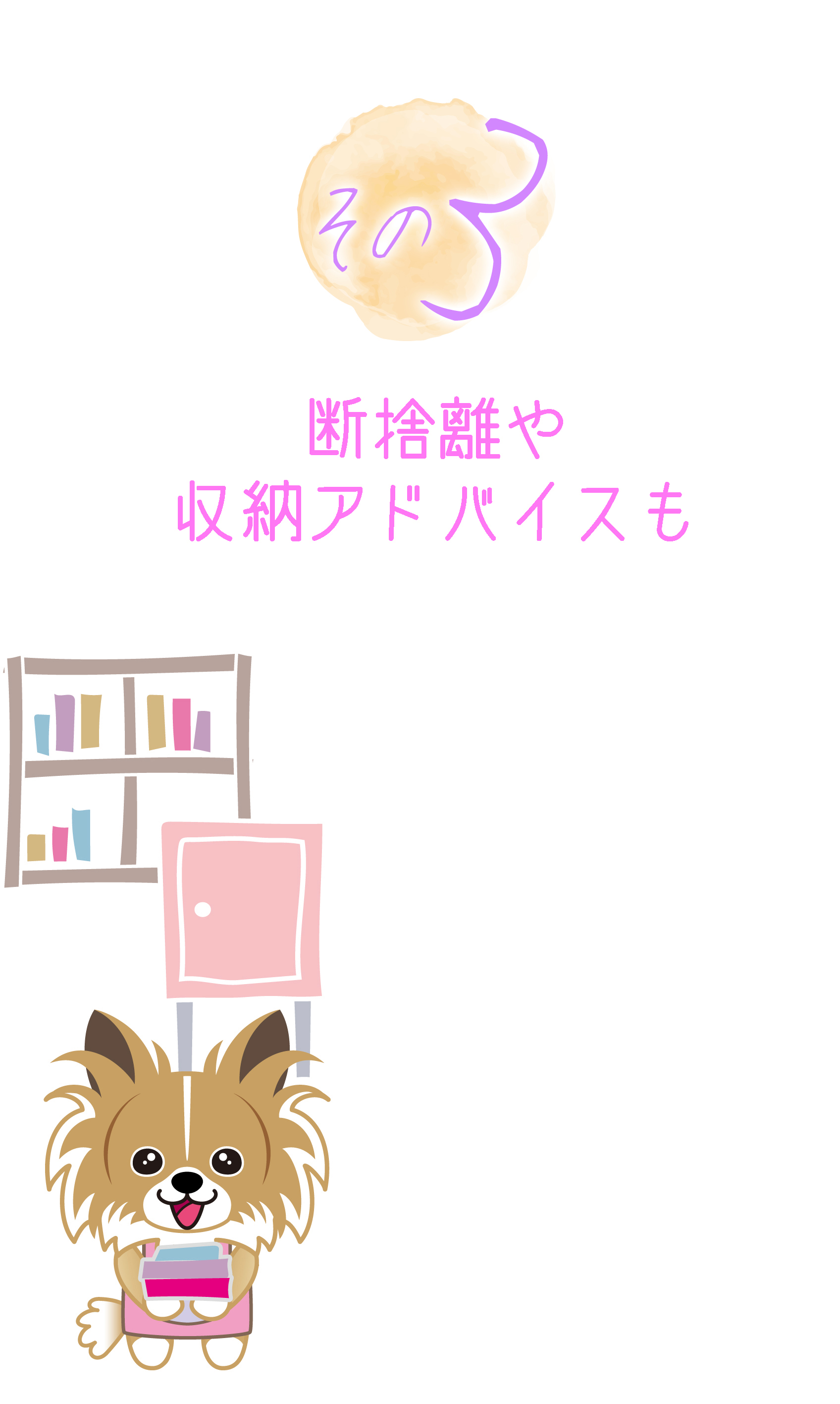 お掃除、お片付け専門のお手伝いをします。お掃除以外でもご要望にお答えできる場合もございますので、ご相談ください。